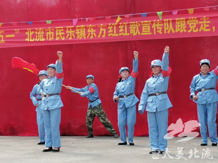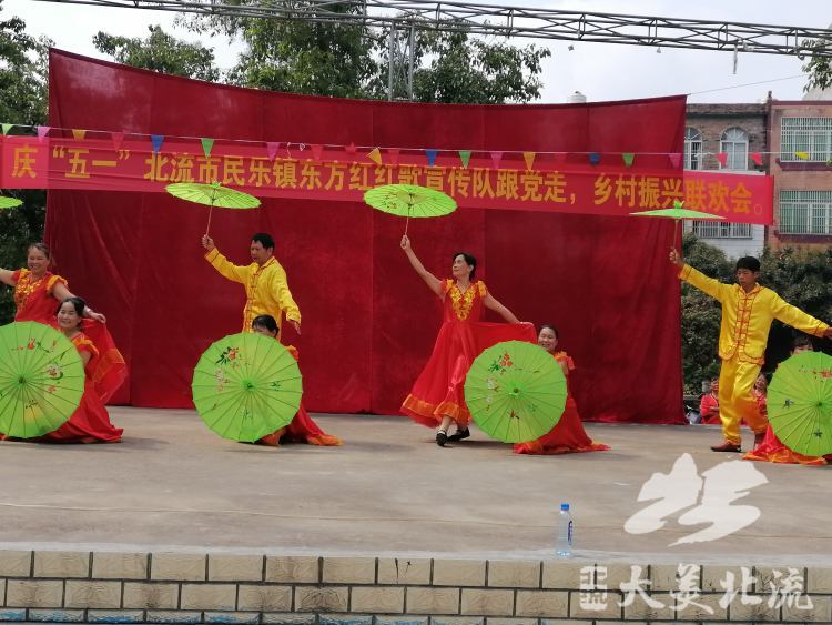 首先登场的是西埌镇独唱《酒醉的蝴蝶》、民安镇松石组表演的歌舞《千万对不起》和民乐一点红舞蹈队《开门红》立即将全场红歌气氛推向高潮。随后北流镇印塘舞蹈队的《祖国你好!》、民乐开心歌舞团表演的《我的家乡最美丽》时不时赢得观众的喝彩声。