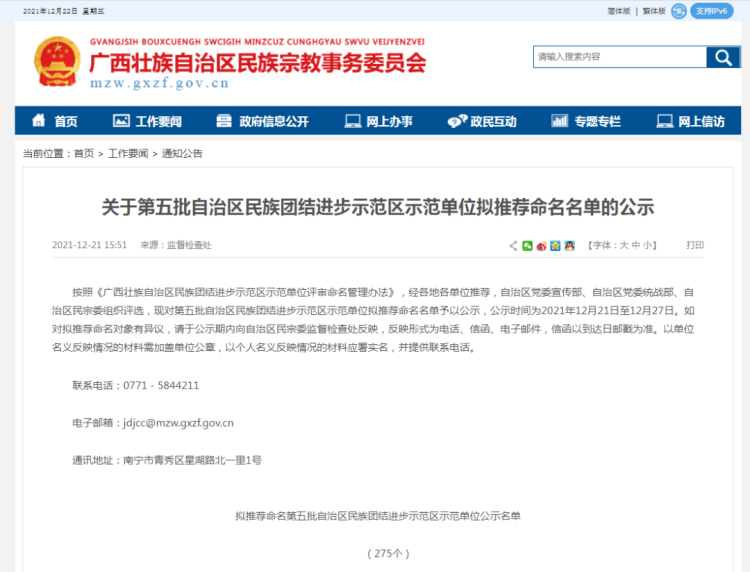 按照《广西壮族自治区民族团结进步示范区示范单位评审命名管理办法》,经各地各单位推荐,自治区党委宣传部、自治区党委统战部、自治区民宗委组织评选,现对第五批自治区民族团结进步示范区示范单位拟推荐命名名单予以公示。